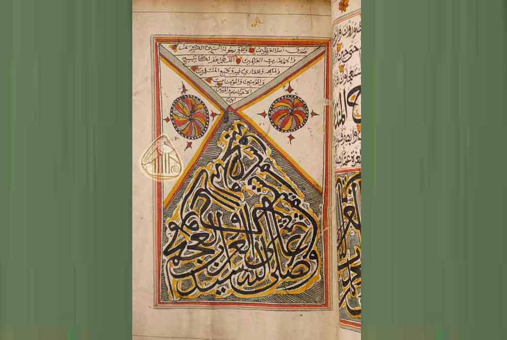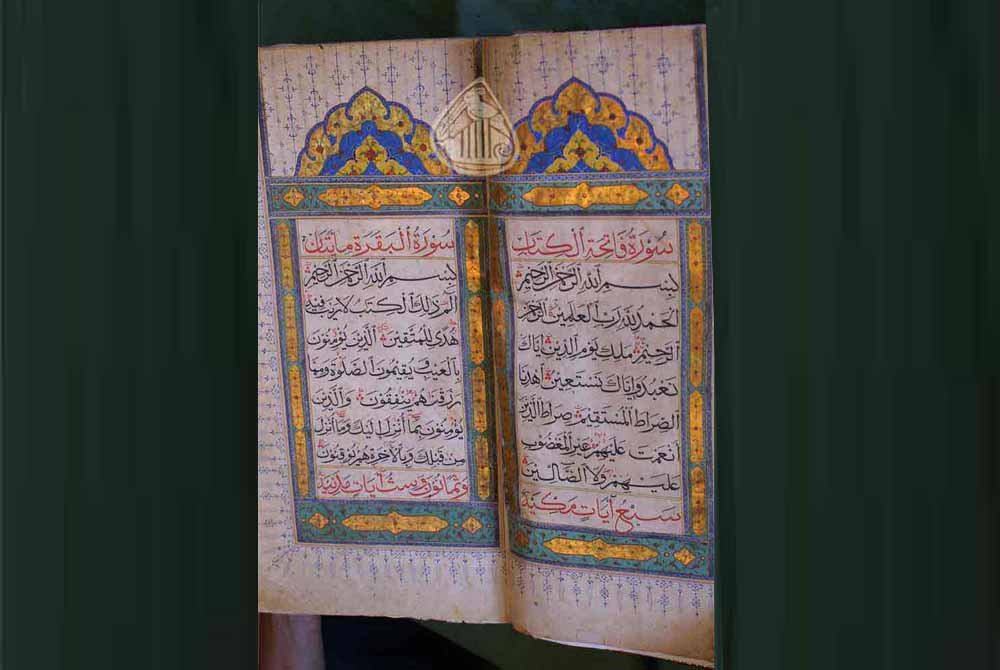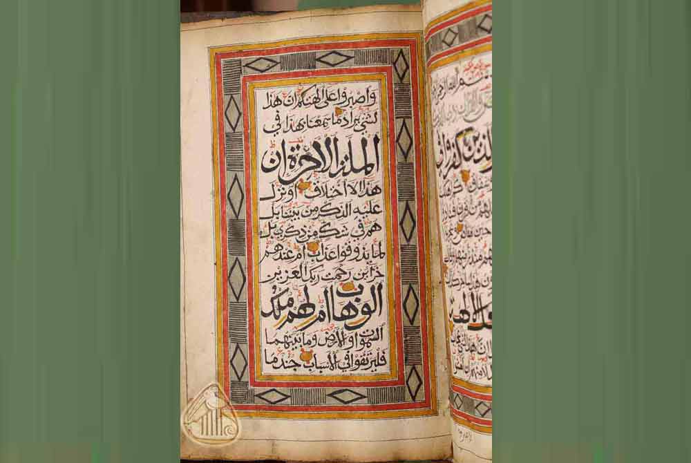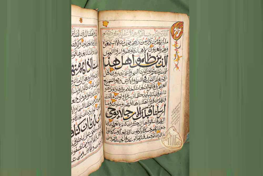 A Quran manuscript written in Arabic script, and has some decorative drawings and different colors.