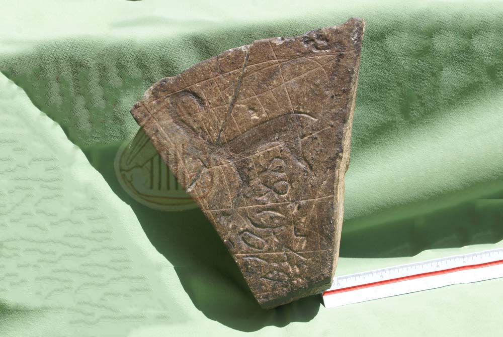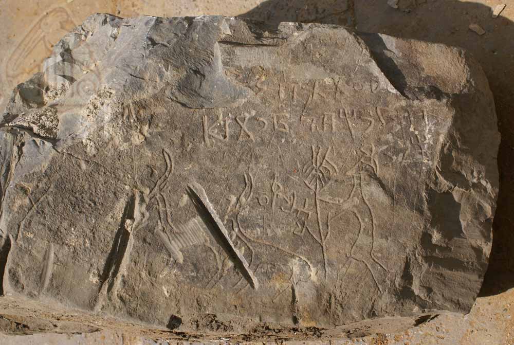 A conical part of stone with engraved graffiti of some letters and an ibex.