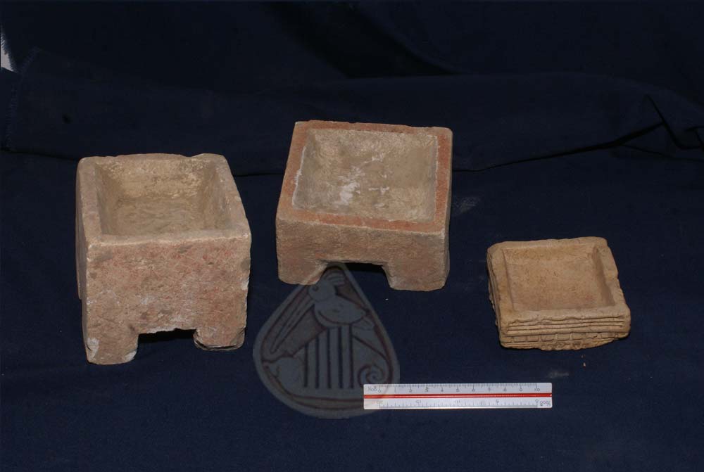 A Group of three incense burner of limestone, in different shapes, one of them has incised linear decorations.