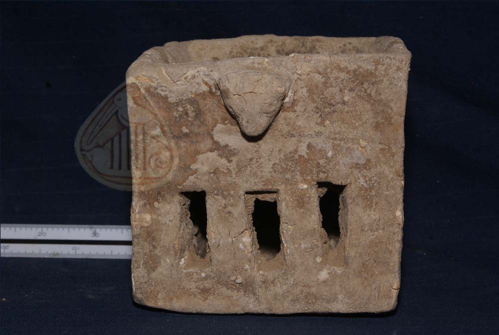 A Square incense burner of limestone, on one side a protrusion in the shape of bull head, and decorative hollow rectangular gaps.