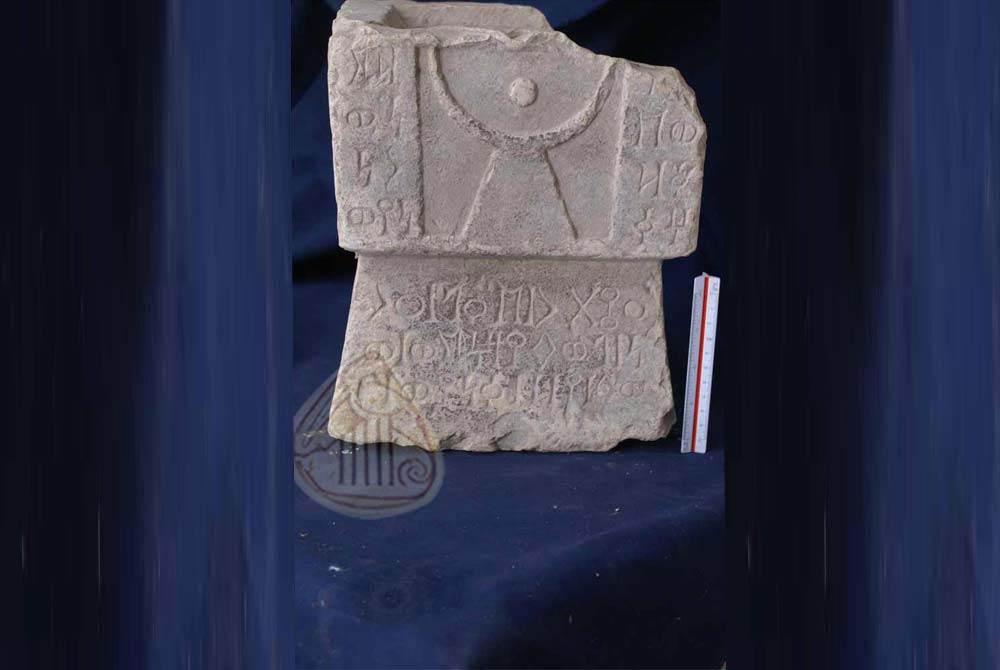 A square incense burner of limestone with an engraving of crescent and Venus, and a three lines Musnad inscription.
