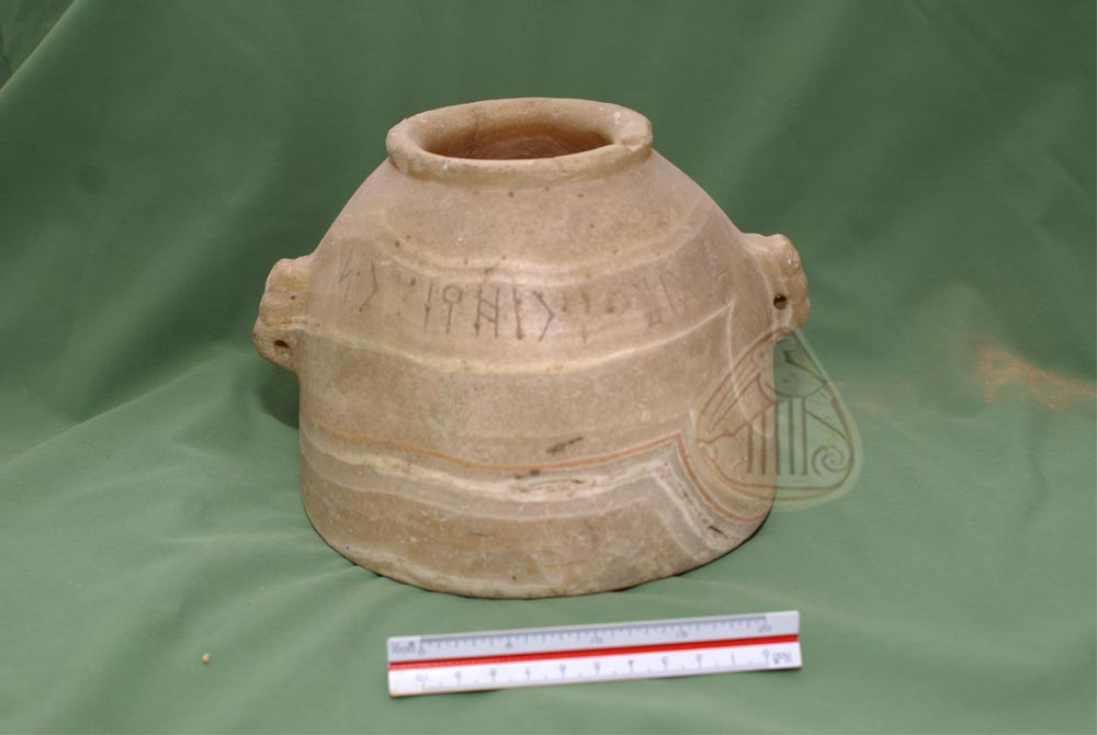 A vessel of marble with a small handles in the shape of human faces, and a band of Musnad inscription.