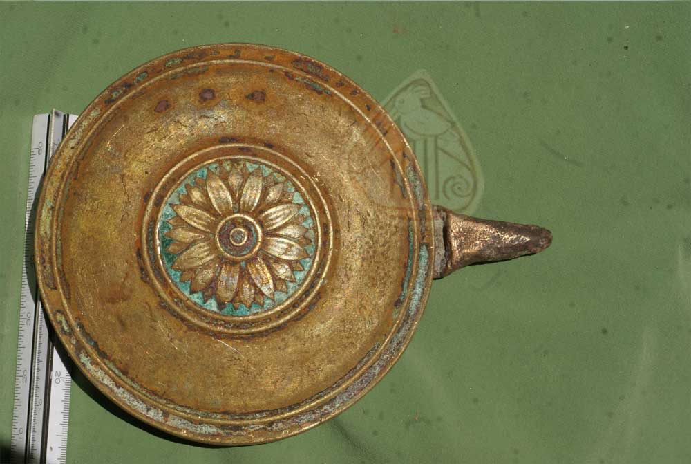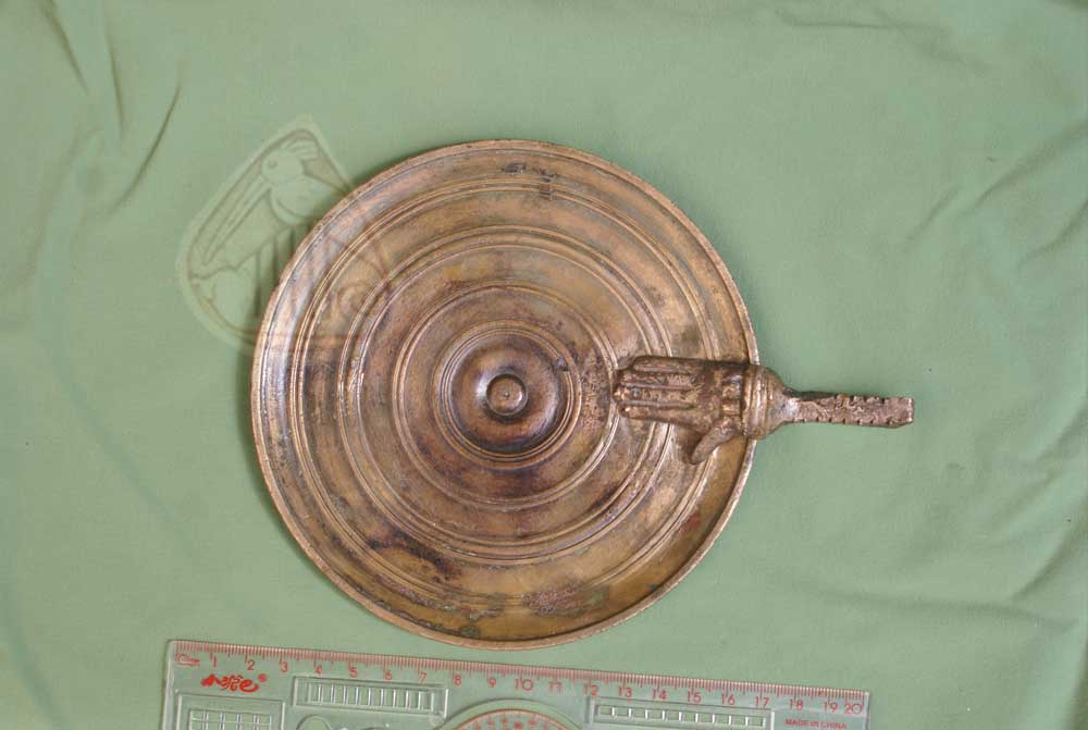 مرآه دائرية الشكل من النحاس للزينة لها مقبض يمثل كف آدمي من الخلف عليها زخارف نباتية ملونة بارزة .